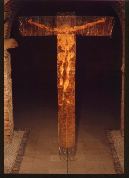 Megpróbáltam anyagban felfoghatóan érzékeltetni a megfoghatatlant. Munkámban a transzparencia és a fény közvetítésére tettem kísérletet. Ezek a használt alapanyagok – a polietilénszál és a rézszál – legjellemzőbb tulajdonságai. A Keresztre Feszített fényként ott hagyott nyomának rögzítését valósítottam meg a kereszt transzparens alapján. Ehhez előzetesen emberi testnyomatokat készítettem.