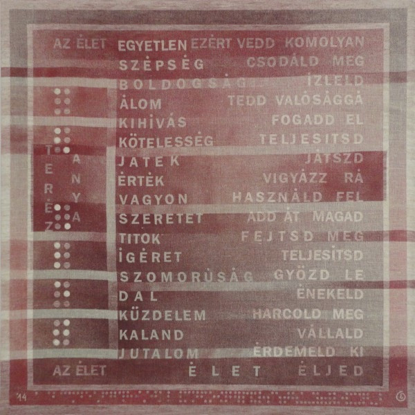 Teréz anya a szolgáló szeretet példaképe. Éld az életet címmel megfogalmazott írását tekinthetjük az élet himnuszának. Ezt a gondolatsort a textil nyelvén jelenítettem meg síkban és térben – textilre festett sorokkal és egy térbe szövött kisplasztikával. Mint a szövet kétirányú szálai, úgy szövődnek össze napjaink az ég és föld közötti fonalra, és így erős szövetté állnak össze. A függőleges szálak mint vezérfonalak vezetik életünket.