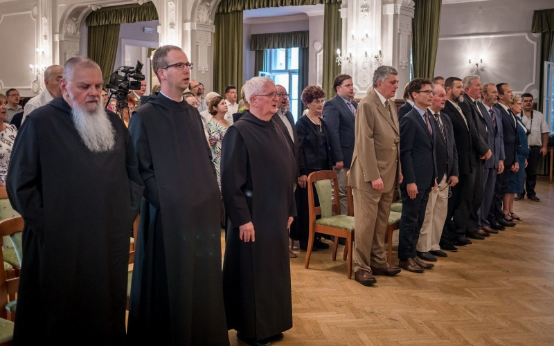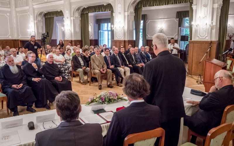 A főpásztori köszöntő után Csurgai Horváth József, a Városi Levéltár és Kutatóintézet igazgatója, a Szent István-emlékérem és díj kuratóriumának tagja ünnepélyesen bejelentette, hogy az idei díjazott Korzenszky Richárd OSB, a Tihanyi Bencés Apátság emeritus perjele.