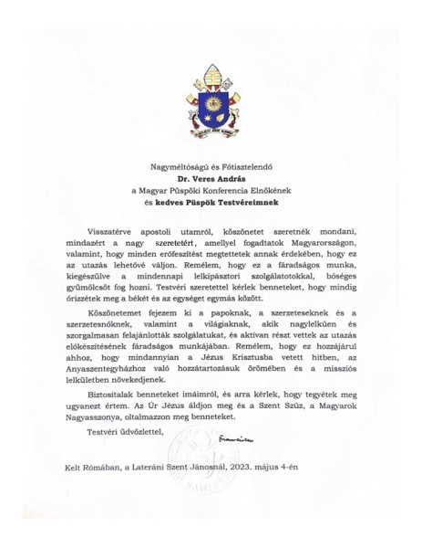 Visszatérve apostoli utamról, köszönetet szeretnék mondani, mindazért a nagy szeretetért, amellyel fogadtatok Magyarországon, valamint, hogy minden erőfeszítést megtettetek annak érdekében, hogy ez az utazás lehetővé váljon. Remélem, hogy ez a fáradságos munka, kiegészülve a mindennapi lelkipásztori szolgálatotokkal, bőséges gyümölcsöt fog hozni. Testvéri szeretettel kérlek benneteket, hogy mindig őrizzétek meg a békét és az egységet egymás között.
