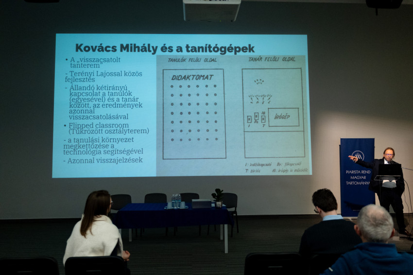 Görbe László SchP előadása Kovács Mihály életútját és pedagógiai-innovációs munkásságát mutatta be, kiemelve úttörő szerepét a kibernetika és az informatikai gondolkodás középiskolai meghonosításában.