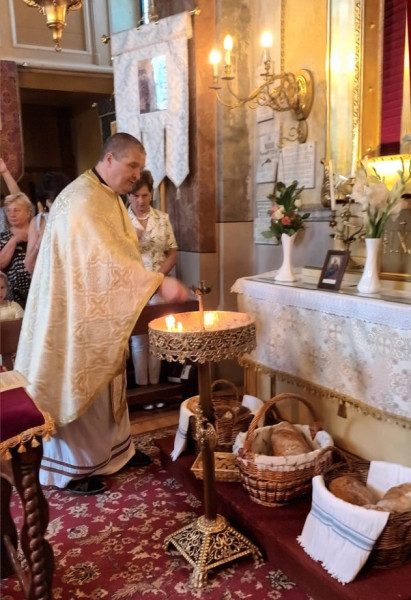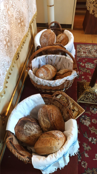 A frissen sült, illatozó kenyerekkel megrakott nagy kosarakat és a maradék kovászból készült krékereket tartalmazó kiskosarakat felvittük a templomba, ahol a Szent Liturgia végeztével Mihály atya megszentelte őket.
