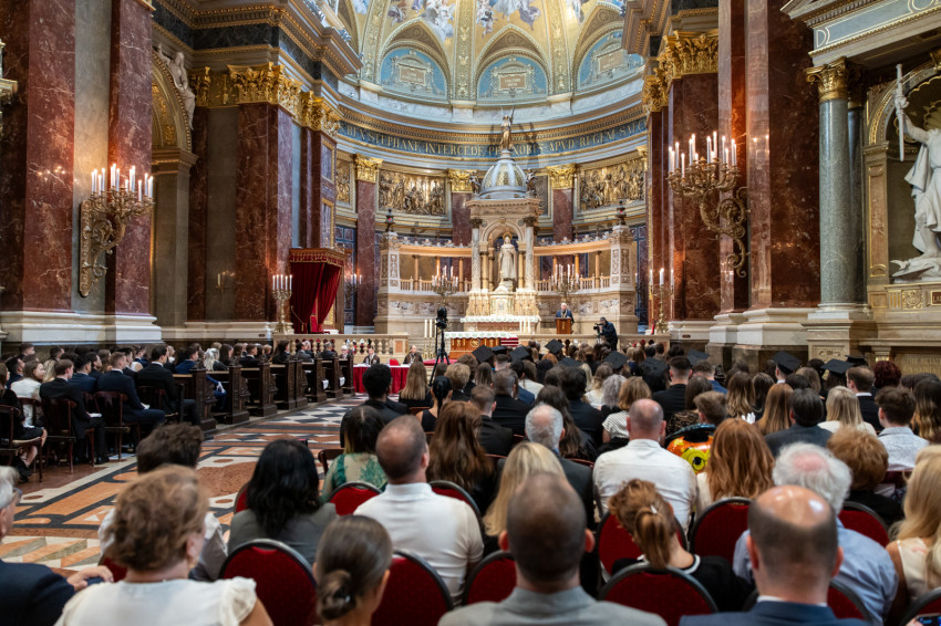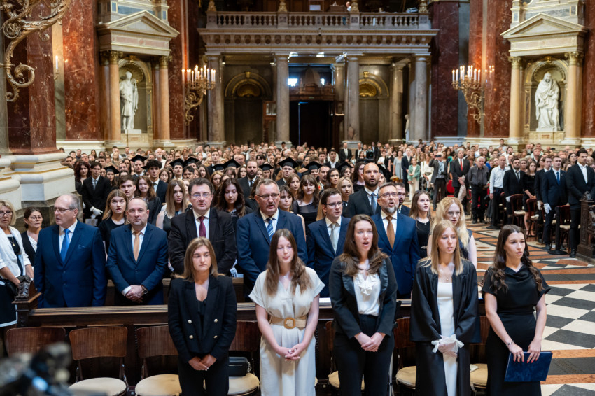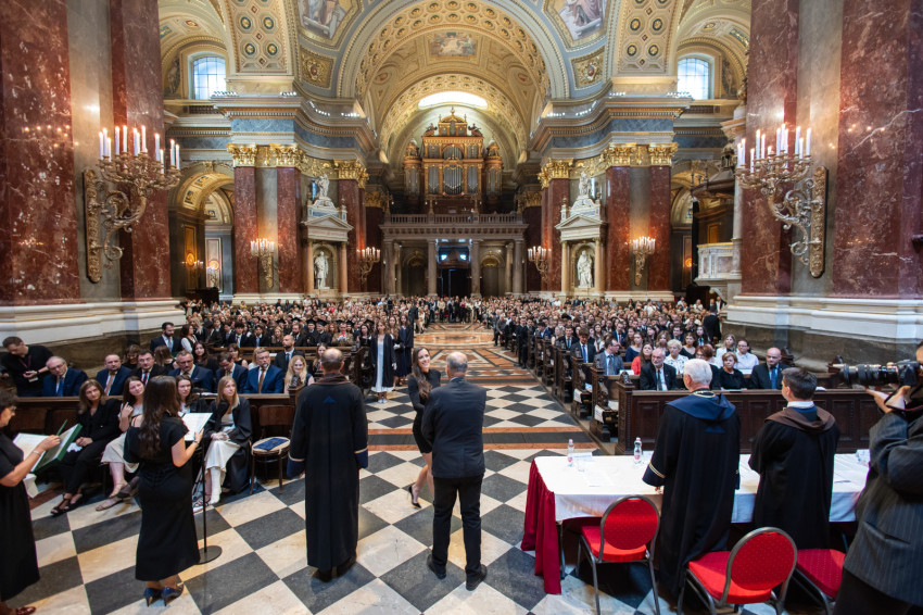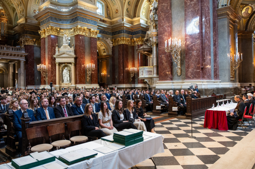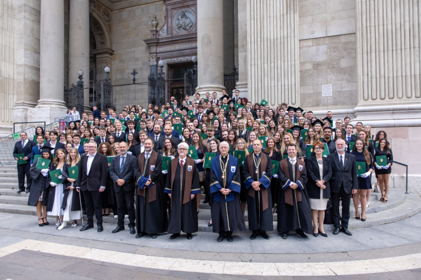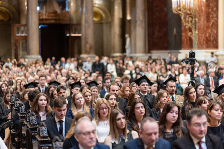 A minisztériumi főtanácsadó buzdította a frissdiplomásokat, hogy „legyenek büszkék, hogy a Pázmányon szerezhettek oklevelet, és itt, a Szent István-bazilikában vehetik át, még akkor is, amikor egyes vélemények szerint itt veszélyeztetik a tudományos integritást, amikor nehezményezik az egyetem nevében használt katolikus szóból eredő kötelezettségeket és ha majd azt állítják, hogy alma materük a vallási extremizmus egyik bástyája.