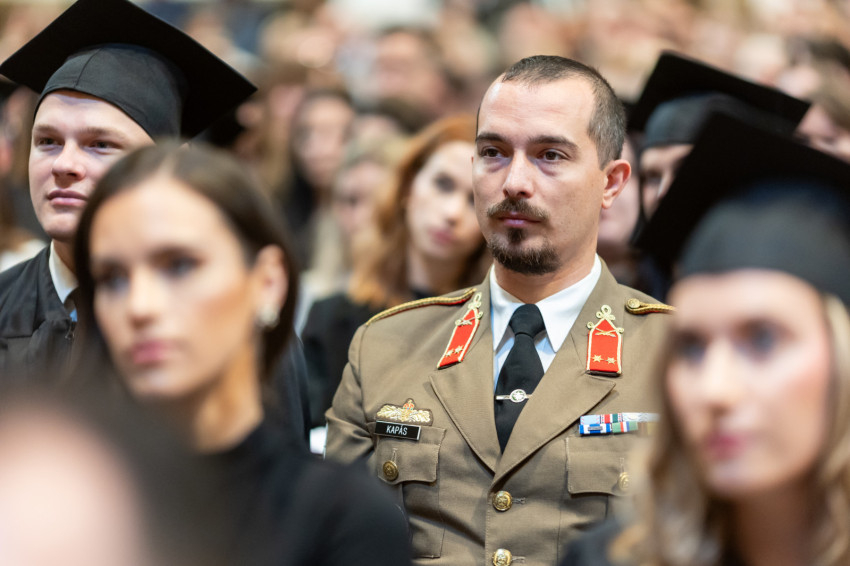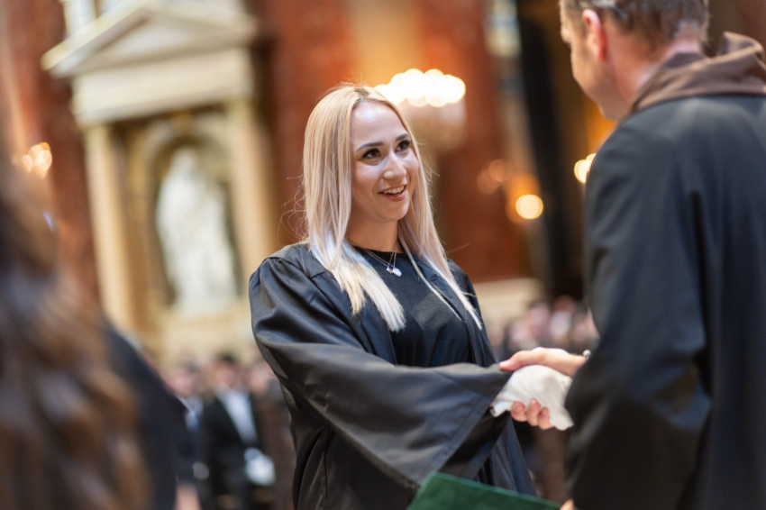 A könyörgések után a jelenlévők közösen elmondták az egyetem imáját, majd a diplomásokat Hegyi László, a Kulturális és Innovációs Minisztérium Felsőoktatásért, Szak- és Felnőttképzésért, Fiatalokért Felelős Államtitkárság főtanácsadója köszöntötte.