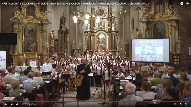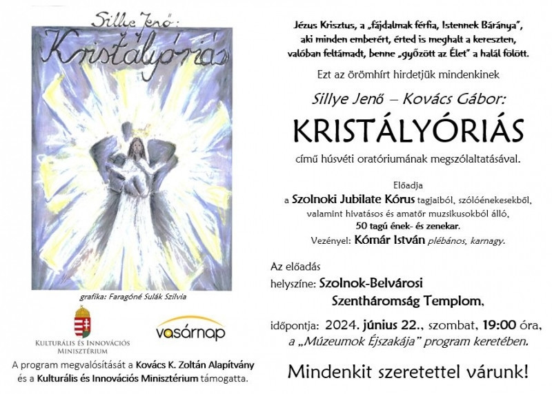Közel 50 fős kórus és zenekar állt össze, hogy június 22-én, a Múzeumok Éjszakáján bemutassák a Kristályóriás című oratóriumot Szolnokon a belvárosi Szentháromság-templomban. Kómár István atya – aki korábban Szolnok-Szandaszőlősön szolgált két évtizeden át, jelenleg Rákóczifalván plébános, és egyben a szolnoki Jubilate Kórus karnagya – nem először vezényelte ezt a művet; 20 évvel ezelőtt már bemutatták a plébánia híveiből szervezett kórussal, amiből a későbbi Jubilate Kórus is megalakult. „Sokszor jelezték nekem a hívek, hogy jó lenne újra elővenni és felújítani a művet – mondta a plébános. – Végül tavaly elkezdtük a felkészülést; rátaláltam a mű zenekari változatára, a kórus énekein pedig én magam alakítottam. Nagyszabású előadást terveztünk, és ez hál’ Istennek, sikerült is.” A produkcióban hivatásos zenészek is részt vettek; a Szolnoki Szimfonikus Zenekar és a helyi katonazenekar tagjai közül többen csatlakoztak István atya meghívására.