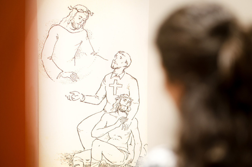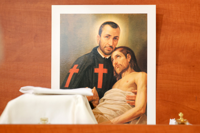 A tavasszal elhunyt Simon András a kamilliánusoknak készített egyvonalas grafikát a rendalapítóról, melyet a kápolna szentélyében egy molinón állítottak ki. Erről beszélt a továbbiakban a tartományfőnök. Ezen három Krisztus-arcot láthatunk: a megdicsőült Krisztusét; a szenvedő Krisztusét a betegben, akit Kamill megölel; ugyanakkor a szent arca is krisztusivá válik, hiszen ha valakit sokáig nézünk, a tekintetünk kezd hasonlítani az övére. Megfigyelhető ez a több évtizedes házasok esetében is: ugyanaz a mosolyuk, ugyanaz a szomorúság vagy derű van az arcukon.