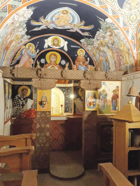 A három méter átmérőjű félgömb kupola középpontjában a Pantokrátor Krisztus látható valódi – füstlemezes – aranyháttérrel. Angyalok tartják a „kaput”, amelyben megjelenik a „mindenható” alakja. Alatta, az ablakok között az ószövetségi próféták jelennek meg, majd folytatódik a teljes ikonográfiai program a szentek soráig, amelyek most nyáron készültek el. Ezzel zárult az ottani munkám, a teljes templombelső kifestése. Az első ottani festményem és egyben a diplomamunkám a Mária elszenderülése volt. Ez a jelenet az ortodox templomokban hagyományosan a bejárat felett kap helyet, a Szent György-hegyi kápolnában viszont a hátsó falra került. E kép különös jelentőséggel bír:
