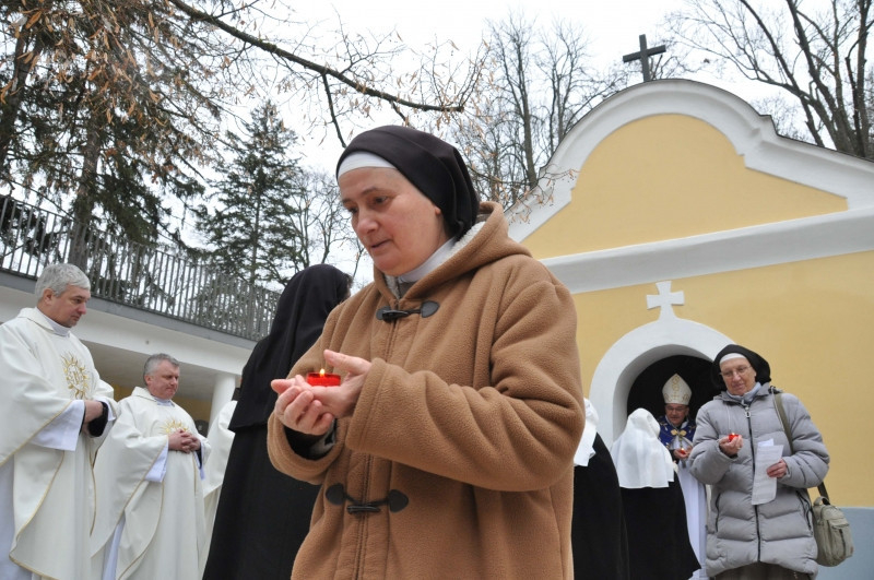 A szentmise elején a megyéspüspök a gyertyaszentelés szertartását az egyházmegyében szolgáló szerzetesek között végezte el.