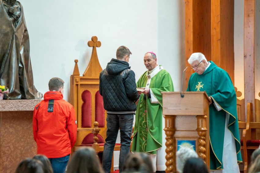A bérmálkozás előtt álló fiatalok egy-egy bibliát vehettek át a főpásztortól ajándékba a felkészülésükhöz.