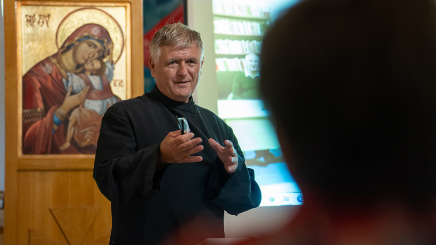 Csaba atya fotókon mutatta meg a büntetés-végrehajtási intézetben található kápolnát, ahol az ikonokat is a fogvatartottak festették az ő ösztönzésére. A szertartások, liturgiák célja nem az, hogy kipipáljuk és túllegyünk rajta, hanem hogy megváltoztassuk az embert: