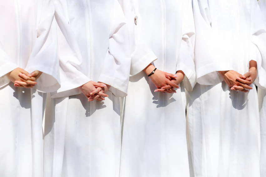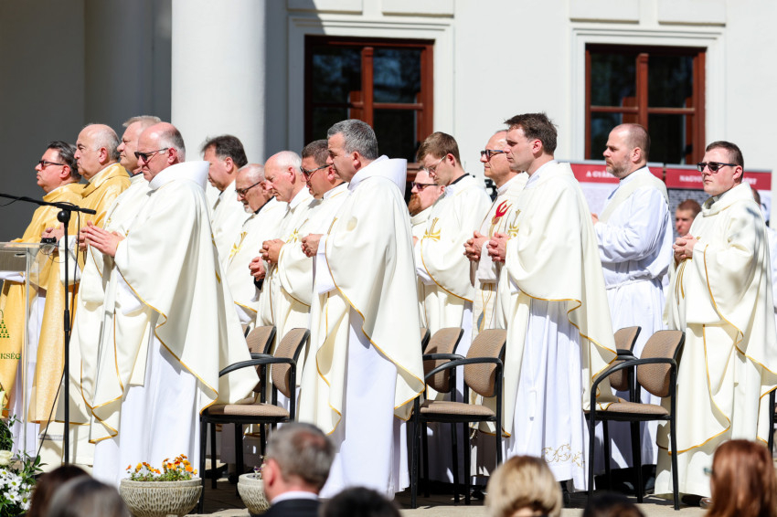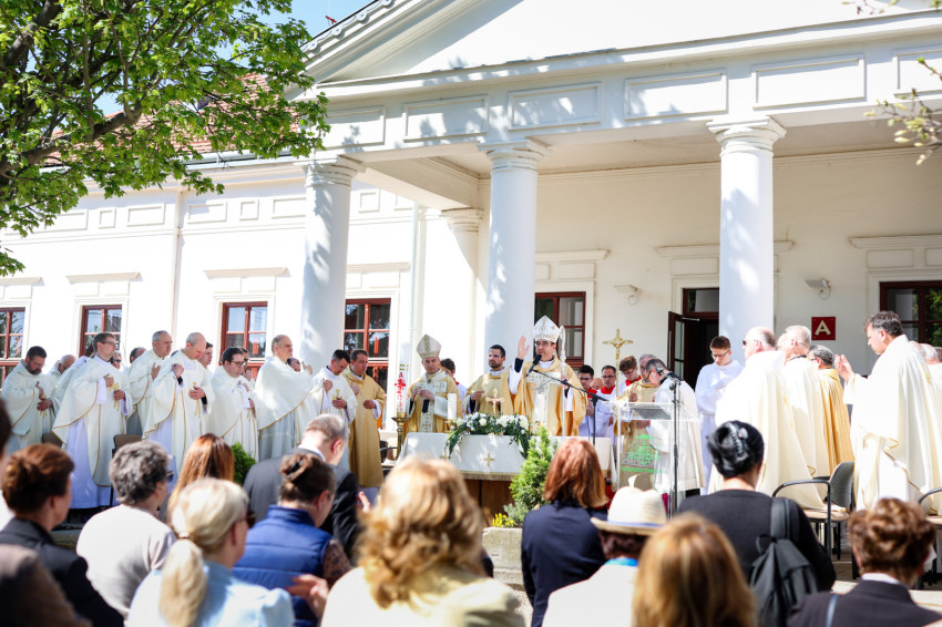 10 órakor bevonult a Veszprémi Főegyházmegye harminc papja az iskola udvarán tartott szabadtéri szentmisére, amelyre több száz ember gyűlt össze.