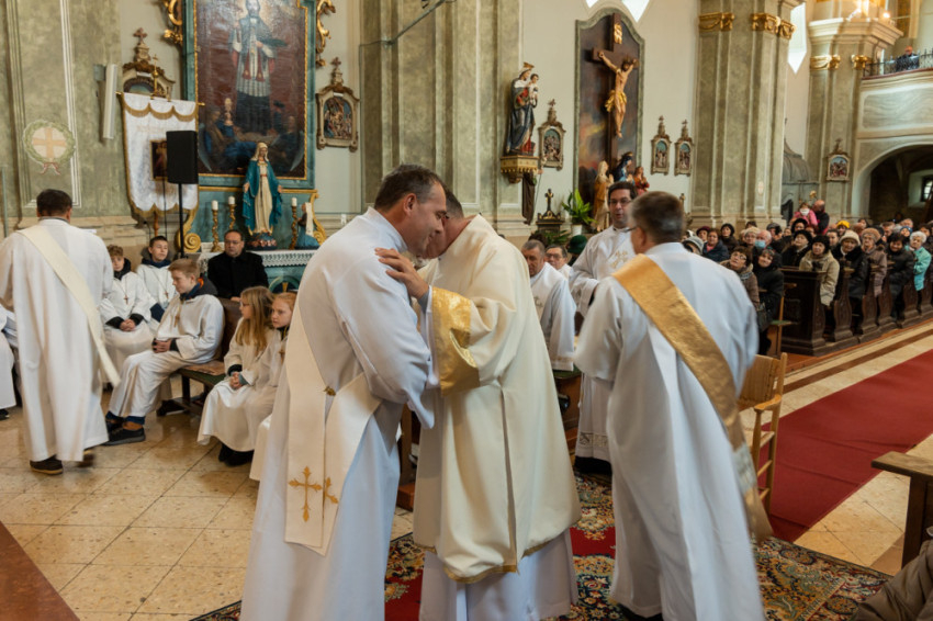 A főpásztor, a jelen lévő papok és diakónusok békecsókkal köszöntötték az újonnan szenteltet, aki ezt követően, a szentmise áldozati részében a püspök jobbján segédkezett.