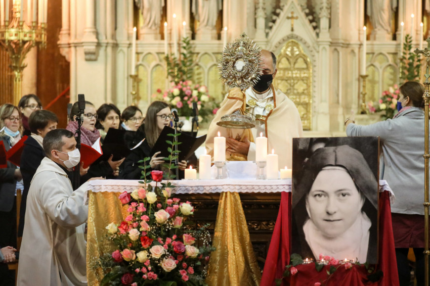 Sára nővér köszöntőjében kiemelte a kármelita szent életének néhány eseményét: Az öt lánytestvérnek, akik később mind szerzetesnővérek lettek, át kellett élniük édesanyjuk korai halálát – Teréz ekkor négyéves volt. Kilencévesen olyan beteg lett, hogy az orvosok lemondtak róla, mígnem Mária mosolya, melyet a lelkében élt át, meggyógyította. Teréz 24 évesen halt meg, XI. Piusz 1925-ben szentté, II. János Pál pedig 1997-ben egyházdoktorrá avatta. A Nyolc Boldogság Közösség védőszentjeként tiszteli a kicsiségét nagyra értékelő francia szentet.