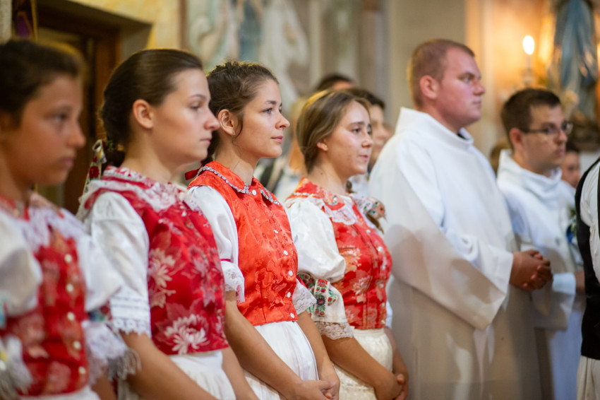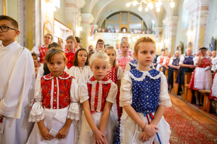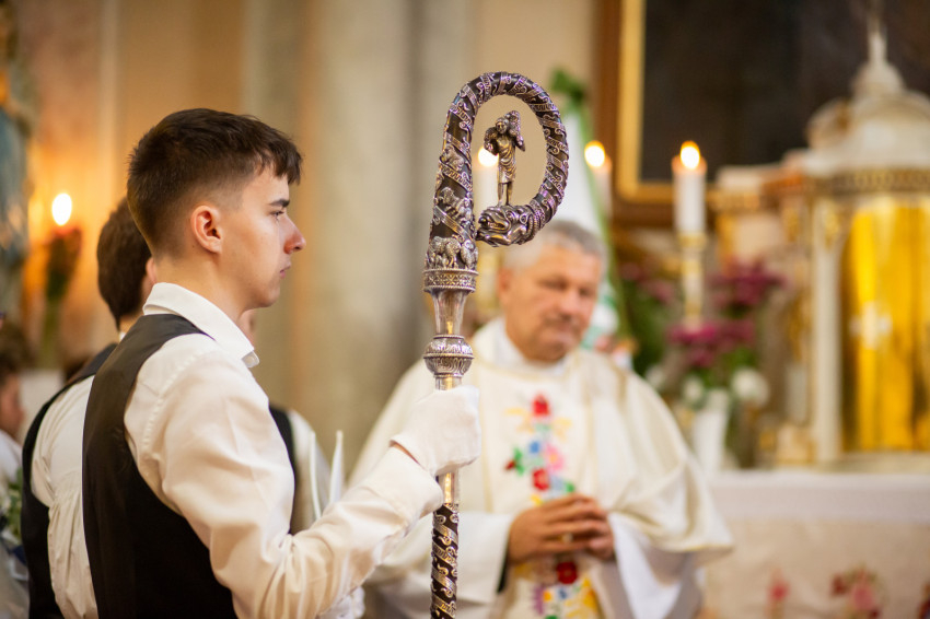 Hosszú sorban vonult be az asszisztencia. Viseltbe öltözött fiatalemberek, ministránsok, Máthé György plébános és Kovács József kisegítő lelkész, Marton Zsolt váci megyéspüspök, a szentmise főcelebránsa és szónoka.