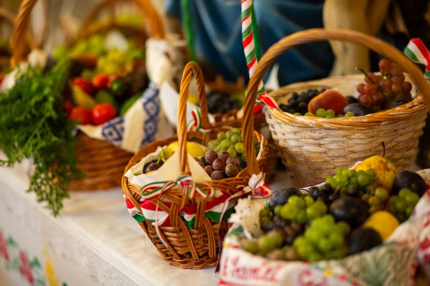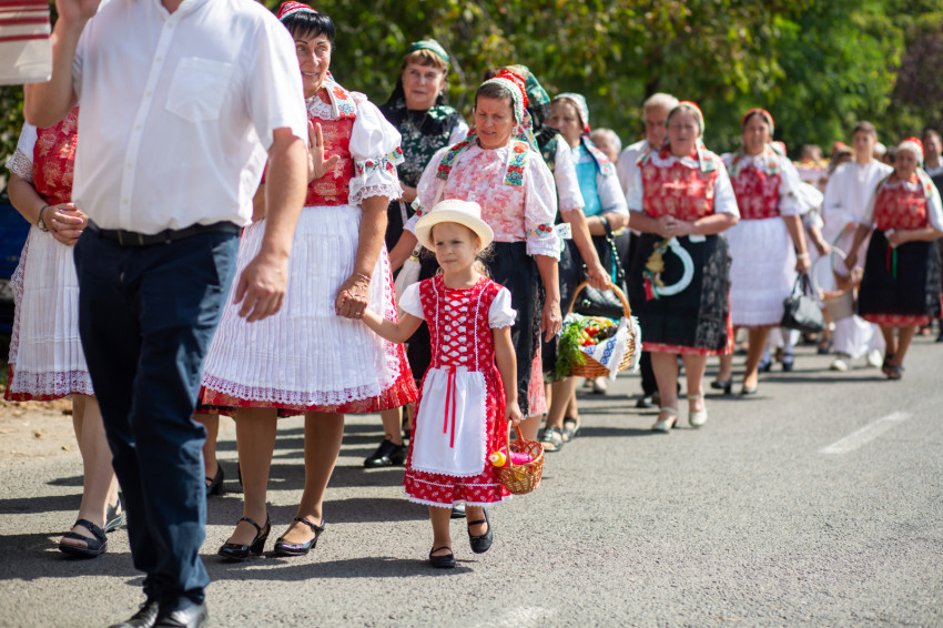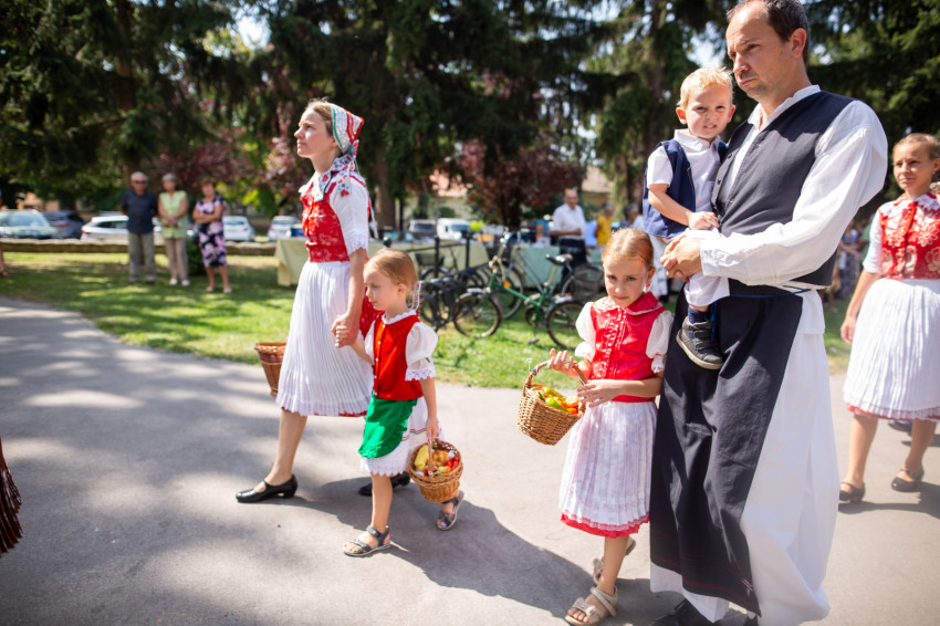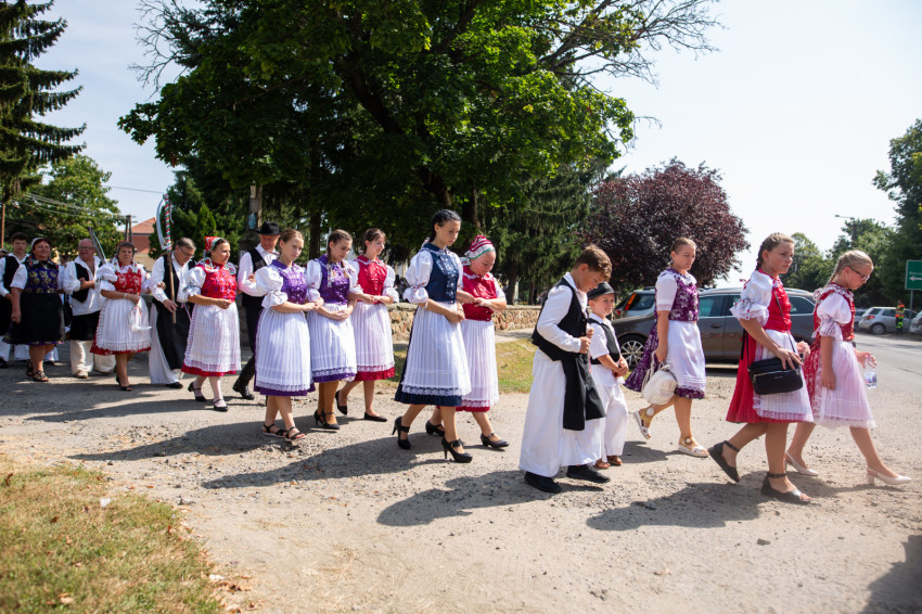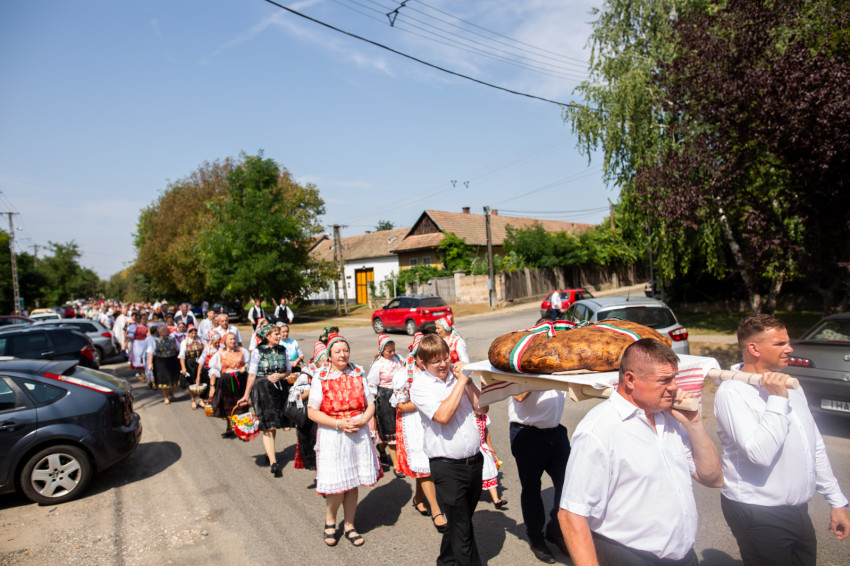 A szentmisét követően indult a körmenet. Aki tehette, népviseletben kísérte a kenyeret, kalácsot, a terményekből összeállított kompozíciókat. Elöl vitték a keresztet, mögötte virágból készült rózsafüzérrel lépkedtek a gyerekek, majd következtek az ételek, egy hordó bor és gyümölcskompozíciók.