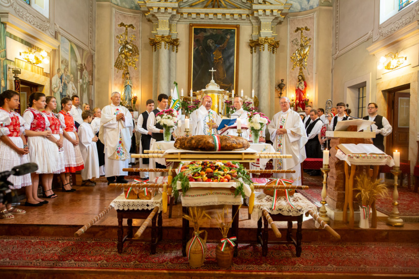 Végül Marton Zsolt megáldotta azt az 50 kilogrammos kenyeret – melyet Szolnokon sütöttek az ünnepre az érsekvadkertieknek – és a többi terményt.