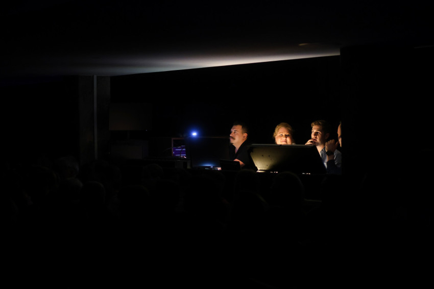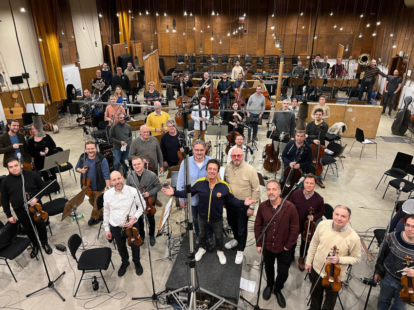 Luc Besson 2023-as DogMan című filmje zenei felvételén a Budapest Scoring Orchestra Sapszon Bálinttal, Éric Serra és Geoff Alexander zeneszerzőkkel