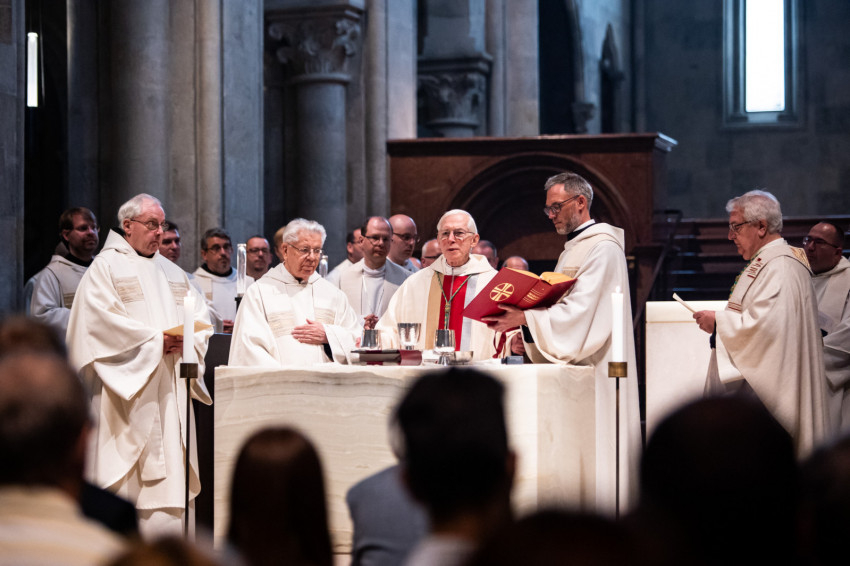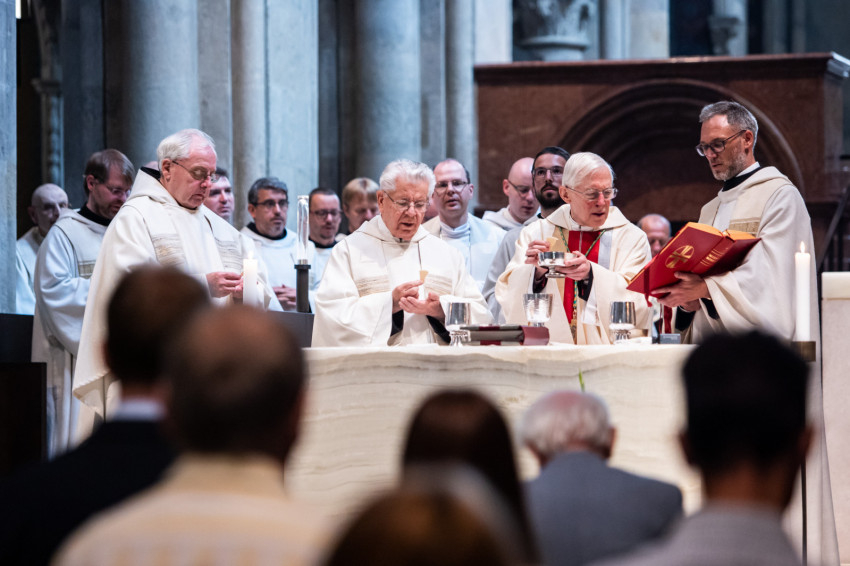 A jubiláns szerzetesek: az aranymisés Várszegi Asztrik püspök, emeritus főapát és az ugyancsak ötvenéves papi szolgálatát ünneplő Kiss Domonkos; a vasmisés Lövey Félix, a gyémántmisés Csóka Gáspár és az ezüstmisés Rainer Nagel.