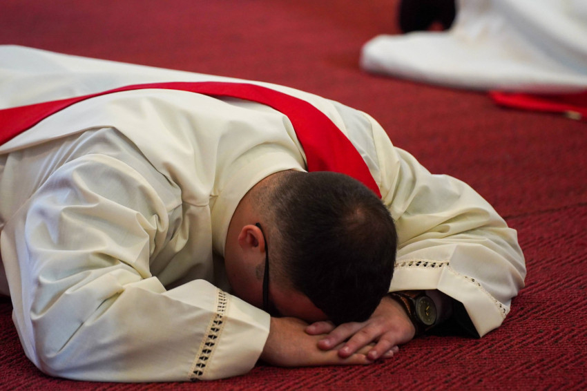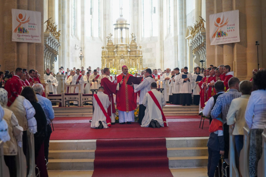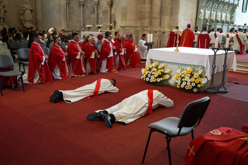 Majd a kézrátétel és a felszentelő ima következett. A papjelöltek egyenként a szentelő püspök elé térdeltek.