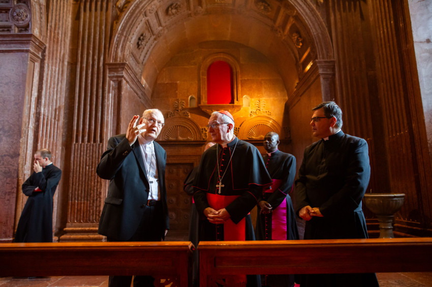 Ezután Parolin bíboros először a szentély falait hintette meg a szenteltvízzel, majd végigvonult a templomhajóban középen egészen a kapuig, és meghintette az épületet.