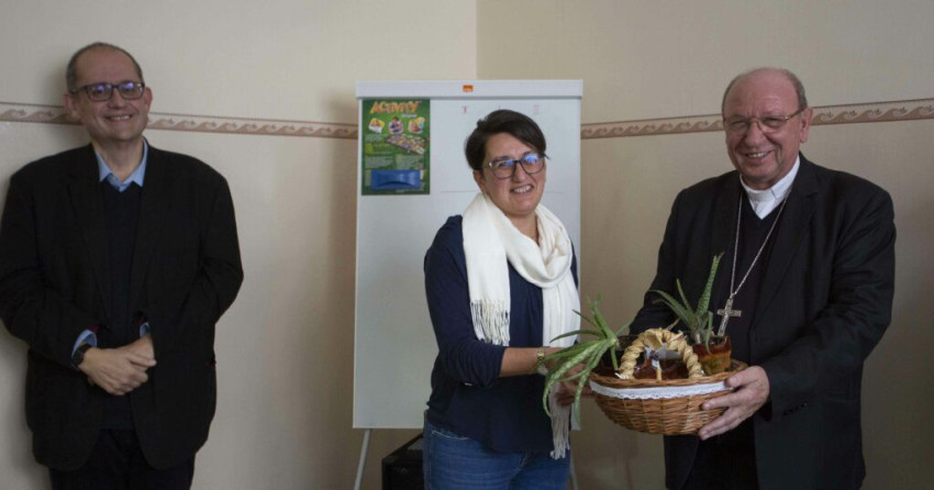 Az intézmény ellátottai a találkozás örömére közösen készítettek egy őszi kompozíciót, amelyet átadtak a főpásztornak.