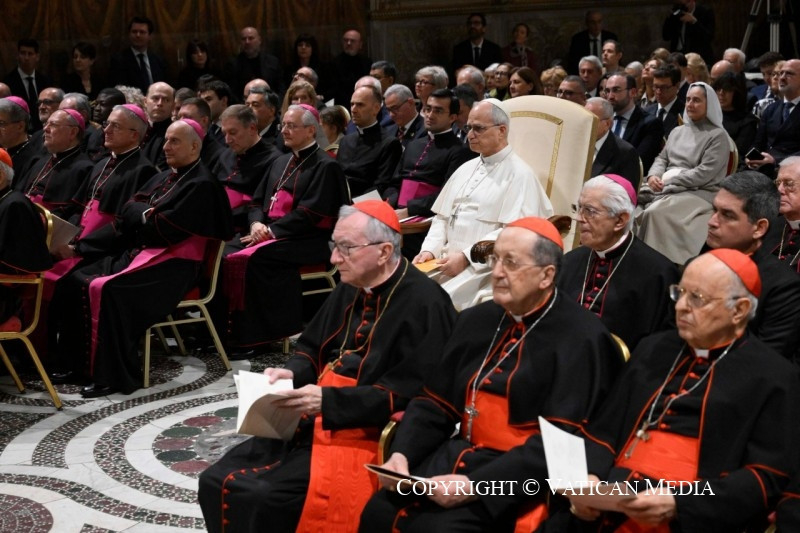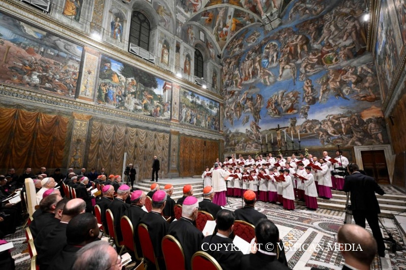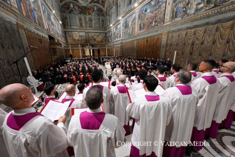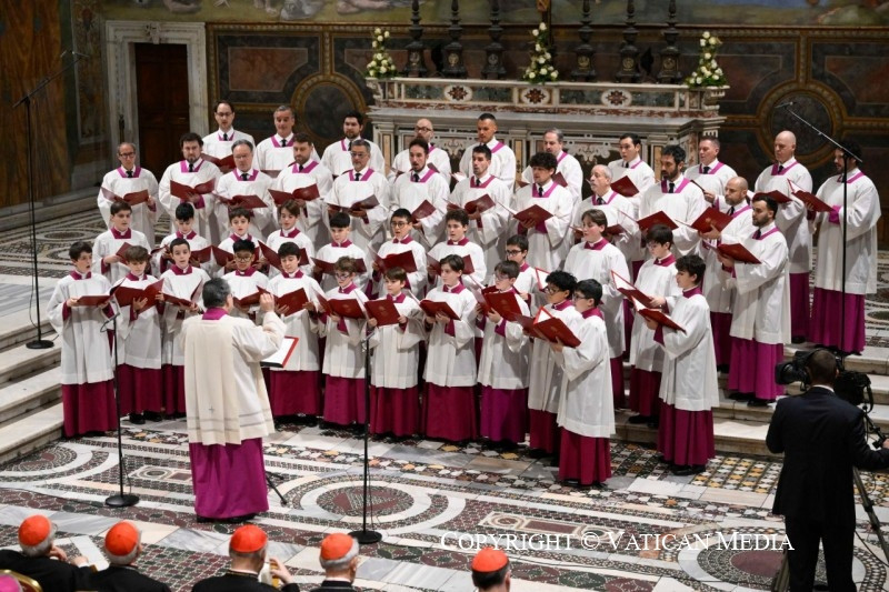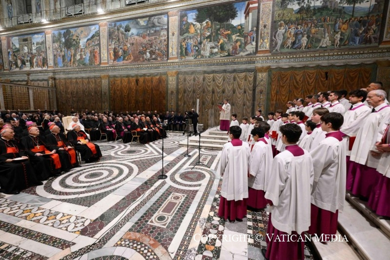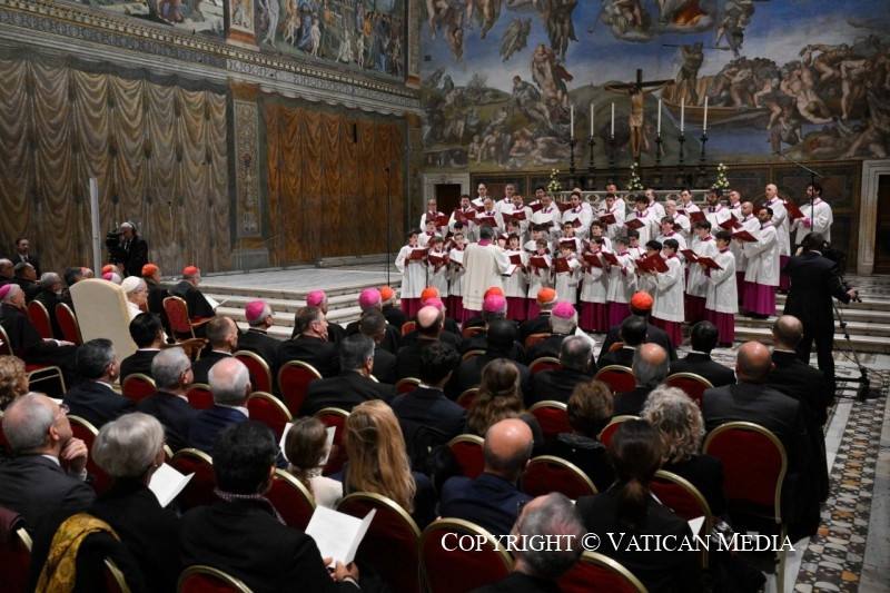 A pápának a rendezvény végén a résztvevőkhöz intézett szavai szerint a karácsonyi elmélkedés a „zene és az ének nyelvén” is megnyilvánul, amely képes mind az elméhez, mind a szívhez szólni. Ezt fejezte ki a több mint 1500 éves múltra visszatekintő kórus, amelyet Marcos Pavan prelátus, karmester vezényelt Michele Marinellivel együtt, aki a Pueri Cantores, az ifjúsági kórus karmestere. XIV. Leó pápa beszédében köszönetet mondott mindkettőjüknek.