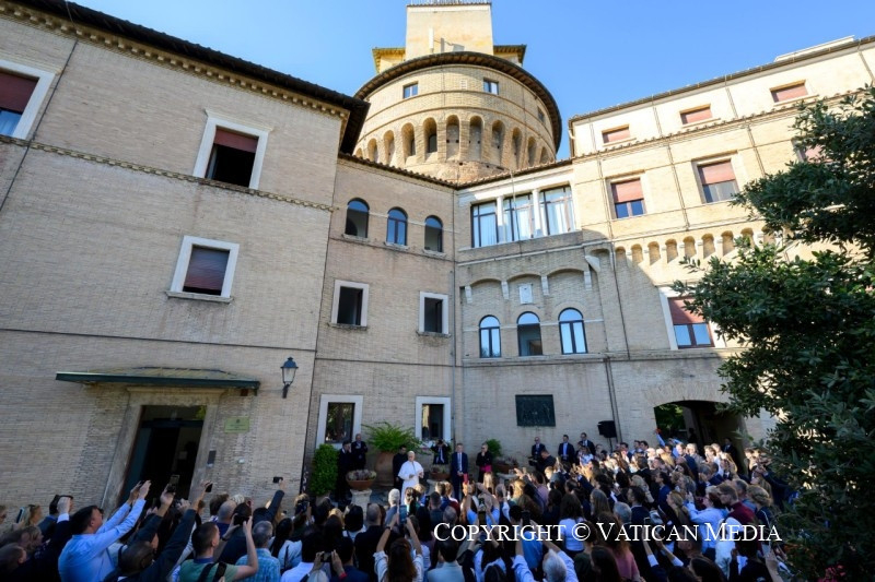 A Szentatyát a találkozó elején Paolo Ruffini, a Kommunikációs Dikasztérium prefektusa köszöntötte, aki többek között elmondta: ez a hely, a Palazzina a rádió otthona fontos része a történelmüknek. A Palazzina épülete eredetileg XIII. Leó nyári rezidenciájához tartozott, később a Vatikáni Rádió talált itt otthonra; napjainkban a televíziós operatőrök használják.