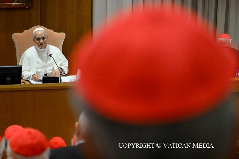 Ma bizonyos értelemben folytatjuk azt az emlékezetes találkozást, amelyben sokatokkal együtt közvetlenül a konklávét követően részem lehetett: „a közösség és a testvériség megélésének alkalmát, a közös gondolkodás és a megosztás idejét, mely arra irányul, hogy támogassa és tanácsaival segítse a pápát az egyetemes Egyház kormányzásának súlyos felelősséggel járó feladatában” (Levél a rendkívüli konzisztórium összehívásáról, 2025. december 12.).