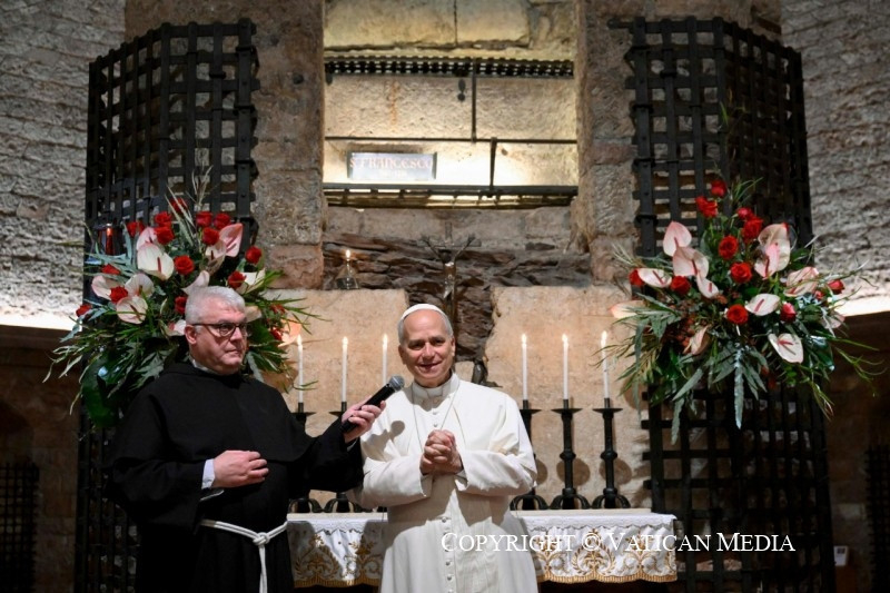 Leó pápa kevéssel fél 9 után felkereste Olaszország védőszentjének sírját. XIV. Leót a téren, a szakadó esőben és hidegben, néhány hívő várta, akik az „Éljen a pápa!” felkiáltással köszöntötték. A bazilika bejáratánál várakozott Marco Moroni, a Sacro Convento (Szent Ferenc-bazilika és kolostor) kusztosa, aki a többi szerzetessel együtt kísérte be Péter utódját a kriptába, amelyet egy fogadalmi olajlámpás világított meg. A lámpára egy verssor van vésve Dante Paradicsomából: „Non è che di suo lume un raggio” („Nem más, mint fényének egy sugara”). Ez a tiszteletadás Ferenc halálának 800. évfordulójához kapcsolódik, a jubileum alkalmából kiállítják a szent földi maradványait.