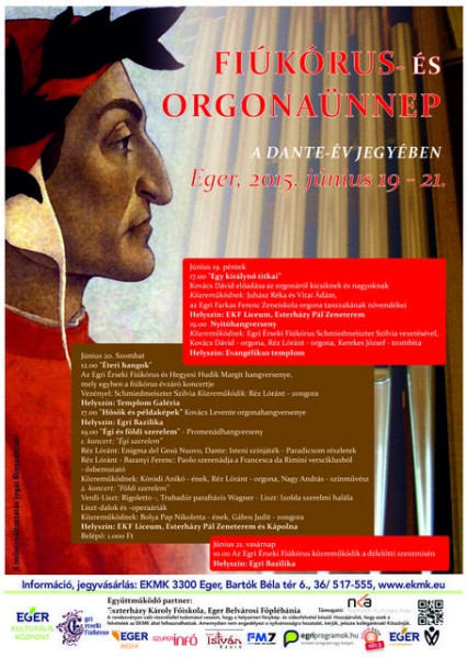 Eredményesen zárult a Dante 750. születésnapjának jegyében rendezett Fiúkórus- és orgonaünnep az Egri Kulturális és Művészeti Központ és az Egri Érseki Fiúkórus szervezésében. A háromnapos programot Réz Lóránt orgonaművész állította össze egri és Eger környéki művészek közreműködésével. Az Egri Érseki Fiúkórus június 20-án, szombaton e rendezvénysorozat keretein belül tartotta meg immáron 4. évzáró koncertjét „Éteri hangok” címmel az egri Templom Galériában.
