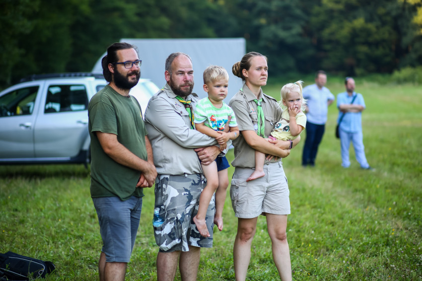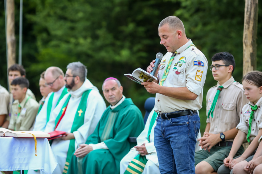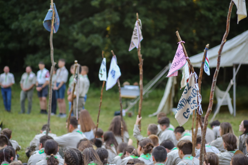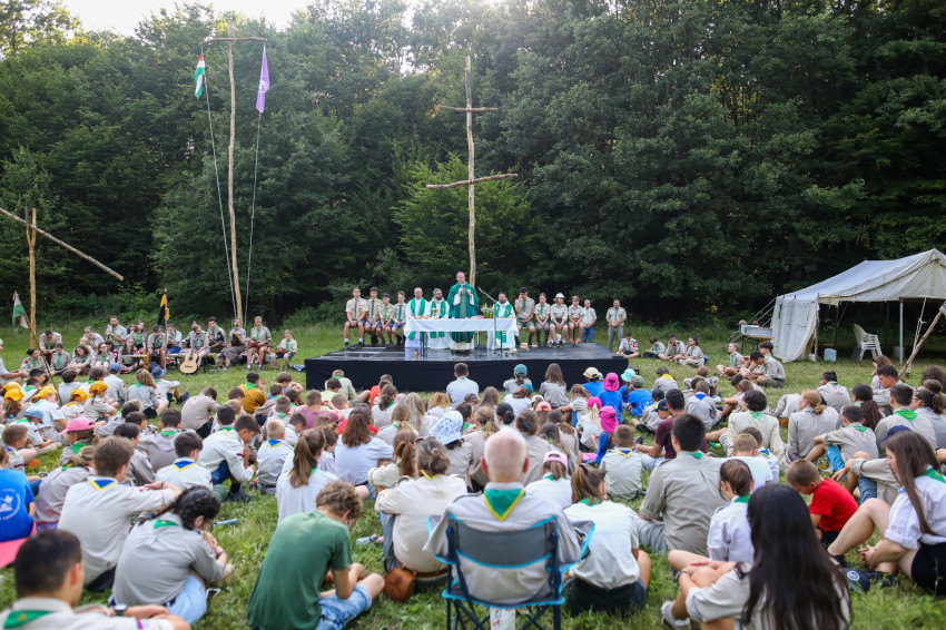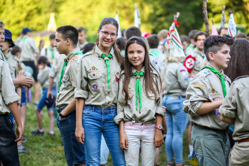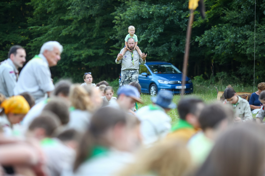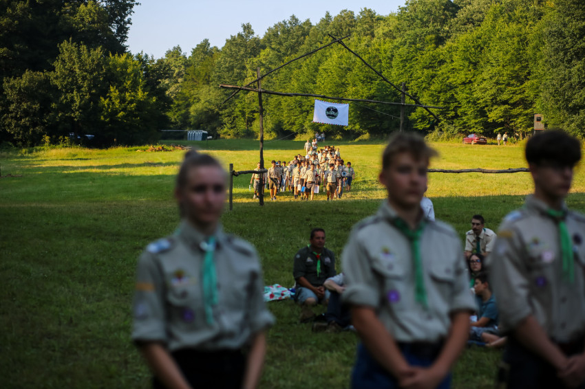 Varga Bálint táborparancsnok a nyitónapról beszélt. Nagy ünnep volt. 43 cserkészjelölt a nagytábor előtt tehetett fogadalmat. „Még egy hét van előttünk, a találkozás, együttlét megannyi élménye.”