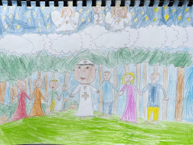 Többen azt ábrázolták, ahogyan a pápa a világért imádkozik. Az egyik kisgyerek a földet rajzolta le, felette az éggel, afölött pedig a ragyogó mennyországgal.