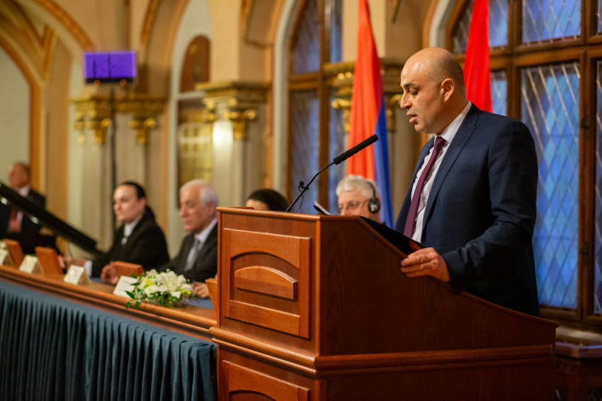 Vahagn Hacsaturján államfő megemlékezett a jereváni Örmény Állami Pedagógiai Egyetem és a Pázmány Péter Katolikus Egyetem többéves kapcsolatáról. A két intézmény 2016-ban írt alá kétoldalú együttműködési megállapodást, és a PPKE-n Armenológiai Tanszék jöhetett létre Kovács Bálint vezetésével. Az államfő méltatta a tanszékvezető kiemelkedő tevékenységét, és kifejezte köszönetét az államközi kapcsolatokért. Mint mondta, bár nincs annyira gazdag kincsünk, mint a szomszéd országoknak, szellemi kincsünk, kultúránk van. A magyar és az örmény nemzet is igyekszik a kultúrát továbbvinni, hiszen a tudomány és a tudás a legfontosabb, anélkül nem lehet fejlődni. Az államfő kifejezte bizalmát, hogy a két nemzet együtt tud működni továbbra is az oktatás, a tudomány továbbfejlesztése érdekében. Mint mondta, megteszünk mindent a békéért, felülemelkedünk a rosszon.