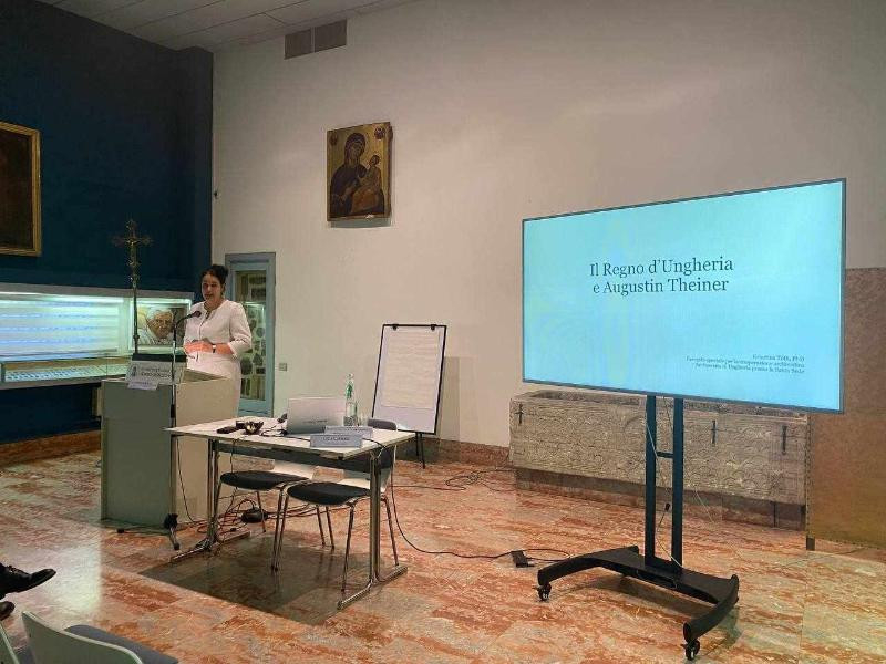 Az olasz áttekintések sorát Tóth Krisztina vatikáni levéltári delegátus előadása zárta, aki Theiner kétkötetes magyar forráskiadása (Vetera monumenta historica Hungariam sacram illustrantia) megszületésének körülményeit vázolta, kiemelve a magyar katolikus püspöki kar nagylelkű anyagi támogatását, majd Theiner munkáinak korabeli magyar értékelését ismertette. Végül a 2000-es évektől e kötetek recepcióját tekintette át a magyar történettudományban, rámutatva a főbb témákra (például kanonokok és egyháziak karrierútja állomásainak azonosítása; Magyarország és a Szentszék kapcsolatai stb.) amelyek kapcsán a magyar történészek eddig haszonnal forgatták a kötetet.