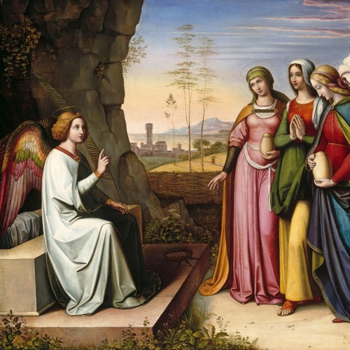 Szombat elmúltával, a hét első napján pirkadatkor Mária Magdolna és a másik Mária elment, hogy megnézze a sírt. És íme, nagy földrengés támadt: Az Úr angyala leszállt az égből, odament, elhengerítette a követ és ráült. Olyan volt a tekintete, mint a villám, a ruhája pedig fehér, mint a hó. Az őrök reszketni kezdtek félelmükben, és szinte halálra váltak. Ekkor megszólalt az angyal, és ezt mondta az asszonyoknak: „Ne féljetek! Tudom, hogy a megfeszített Jézust keresitek. Ő nincs itt, mert feltámadt, amint megígérte. Jöjjetek, nézzétek meg a helyet, ahol feküdt! És siessetek, mondjátok meg tanítványainak, hogy feltámadt a halottak közül, és előttetek megy Galileába. Ott viszontláthatjátok őt! Íme, én megmondtam nektek!” Erre elsiettek a sírtól. Remegve, de nagy örömmel futottak, hogy megvigyék a hírt a tanítványoknak. És íme, egyszerre csak Jézus jött velük szemben, és megszólította őket: „Üdv nektek!” Ők pedig odasiettek hozzá, leborultak előtte, és átkarolták a lábát. Ekkor Jézus így szólt hozzájuk: „Ne féljetek! Siessetek, vigyétek hírül testvéreimnek, hogy menjenek Galileába, mert ott viszontláthatnak engem.”