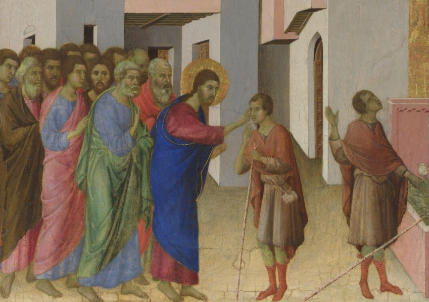 Amikor Jeruzsálembe menet Jézus Jerikó városához közeledett, egy vak koldus ült az út szélén. Amint ez meghallotta, hogy sokan vonulnak arra, megkérdezte, mi történik. Mondták neki, hogy a názáreti Jézus jön errefelé. Erre kiáltozni kezdett: „Jézus, Dávid fia könyörülj rajtam!” Akik elöl mentek, csitították, hogy hallgasson. De ő annál jobban kiáltotta: „Dávid fia, könyörülj rajtam!”