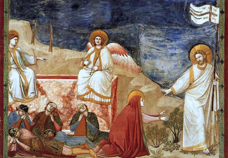 A hét első napján, (húsvétvasárnap) kora reggel, amikor még sötét volt, Mária Magdolna kiment Jézus sírjához. Odaérve látta, hogy a követ elmozdították a sírtól. Amint ott sírdogált, betekintett a sziklasírba, és ahol Jézus holtteste feküdt, két, fehér ruhába öltözött angyalt látott. Ott ültek, az egyik a fejnél, a másik a lábnál.
