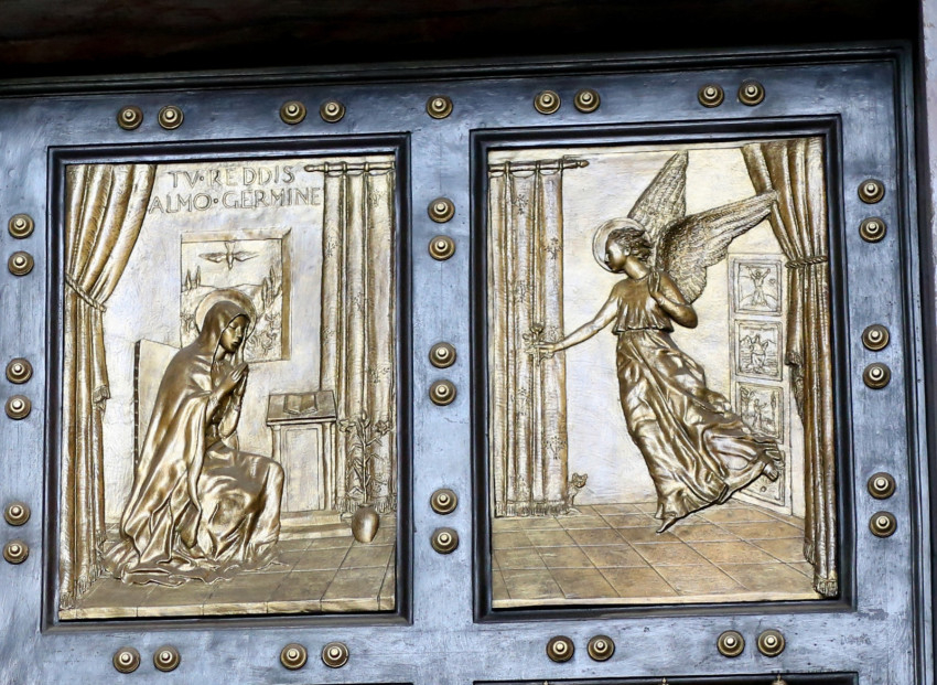Hat hónappal Keresztelő János születésének hírüladása után Isten elküldte Gábor angyalt Galilea Názáret nevű városába egy szűzhöz, aki jegyese volt egy férfinak, a Dávid házából való Józsefnek. A szűz neve Mária volt. Az angyal belépett hozzá, és így szólt: „Üdvöz légy, kegyelemmel teljes! Az Úr veled van! Áldottabb vagy te minden asszonynál!” Ennek hallatára Mária zavarba jött és gondolkodóba esett, hogy miféle köszöntés ez.