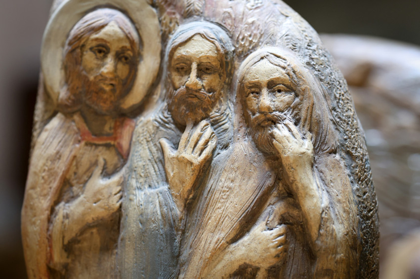 Közben odaértek a faluhoz, ahová tartottak. Úgy tett, mintha tovább akarna menni. De azok marasztalták és kérték: „Maradj velünk, mert esteledik, és lemenőben már a nap.” Betért tehát, hogy velük maradjon. Amikor asztalhoz ültek, kezébe vette a kenyeret, áldást mondott, megtörte, és odanyújtotta nekik. Erre megnyílt a szemük, és fölismerték. De ő eltűnt előlük.