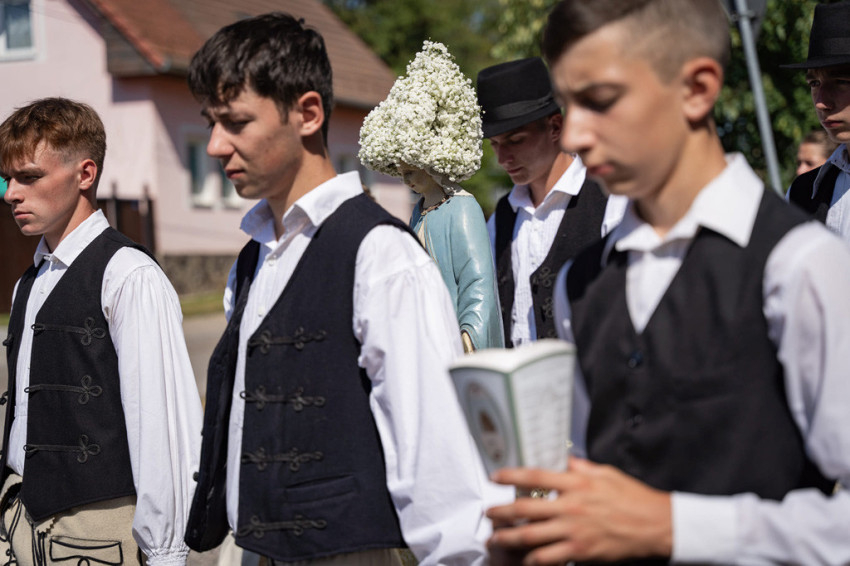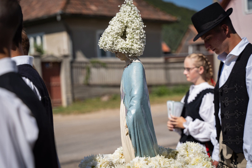 A kis szobrot négy fiú vitte a templomba, őket pedig – a Szűzanya tizenkét csillagból álló koronáját jelképezve – jobbról és balról hat fiú és hat lány gyertyával kísérte, kis mécsessel a kezükben. A virágkoronát két lány vitte a templomba.