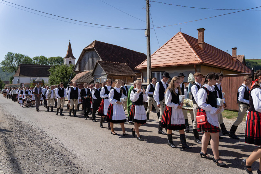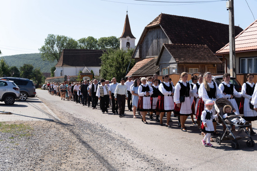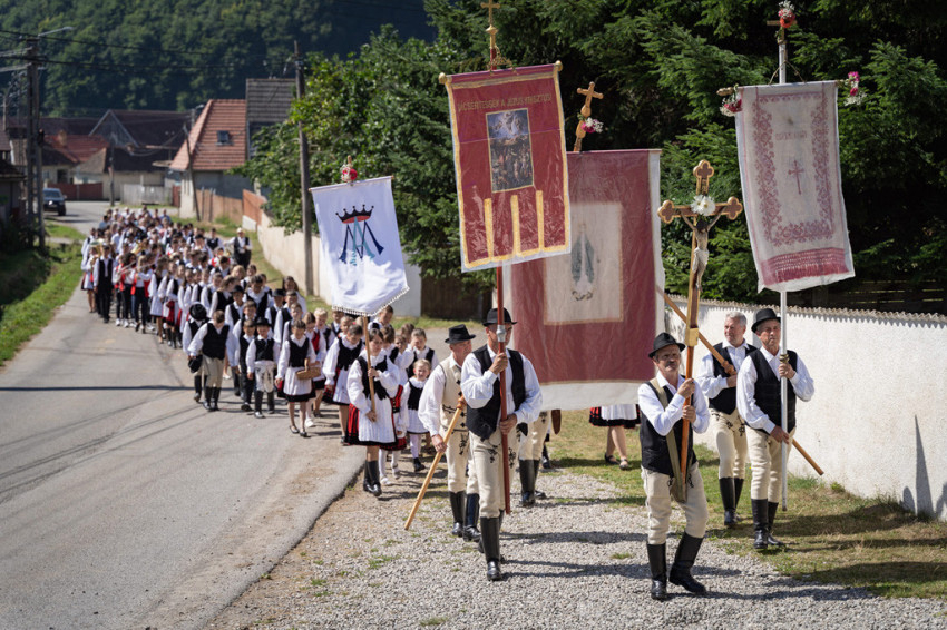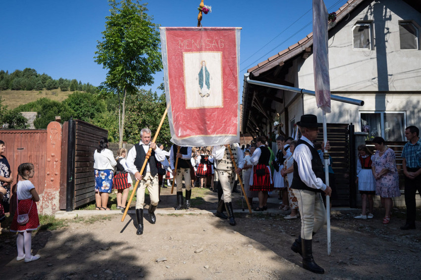 A felajánlás után a hagyományoknak megfelelően a megkoronázott Szűzanyát mint Csíkmenaság királynőjét énekes körmenetben vitték körbe a település központjában a népviseletbe öltözött hívek.