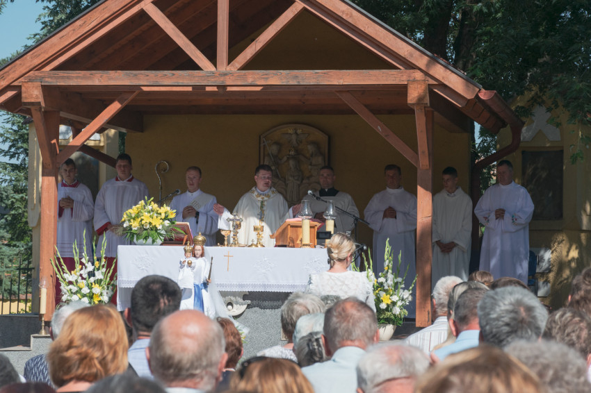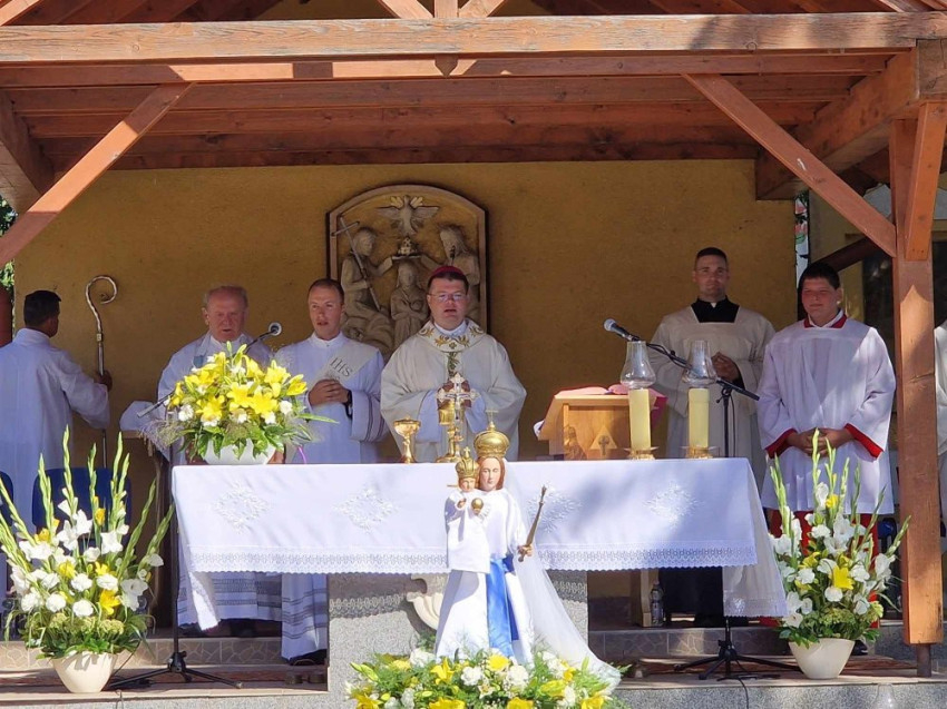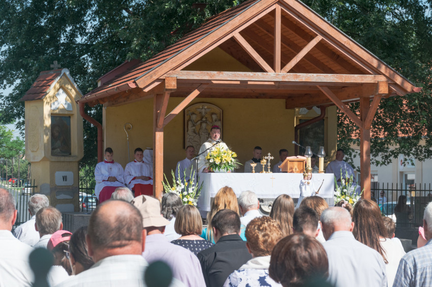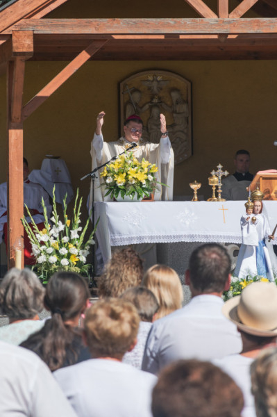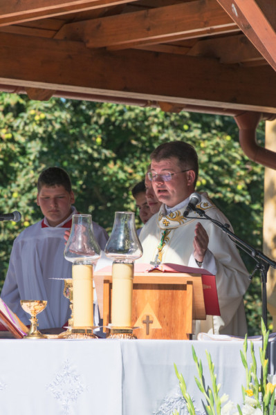 Az ünnepi szentmisét a hagyományoknak megfelelően szabadtéren, a templom melletti kálvárián tartották. A körülkerített tér és környéke idén is megtelt ünneplőkkel.