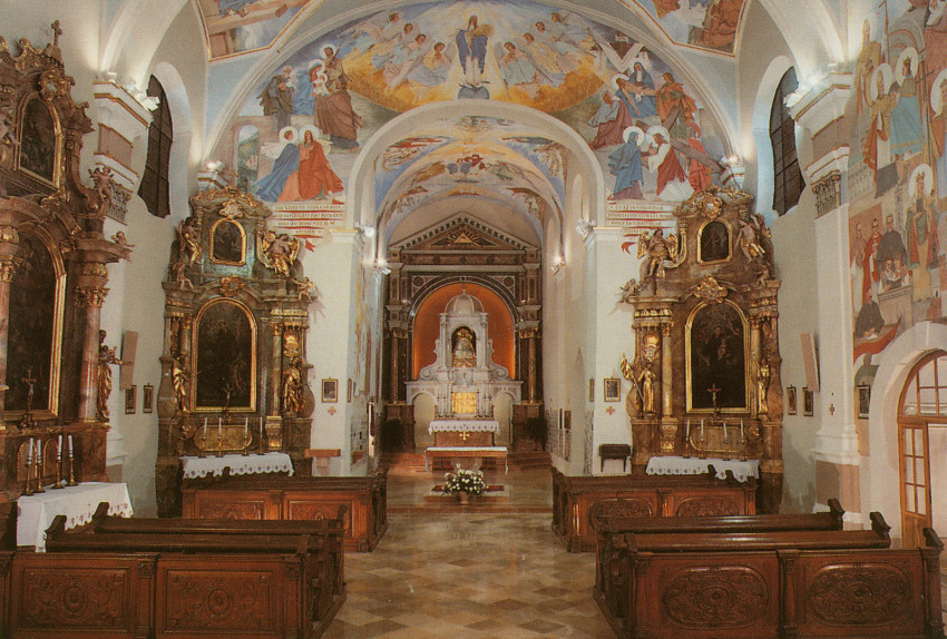 A templomot körbejárva különböző szentek alakjai láthatók (például Assisi Szent Ferenc, Remete Szent Pál, Szent Antal, Szent Sebestyén, Keresztelő Szent János). A templom falain a zarándokok az ájtatosság megnyilvánulásaként hálaadásból, illetve felajánlásként adományozott ajándékai kaptak helyet.