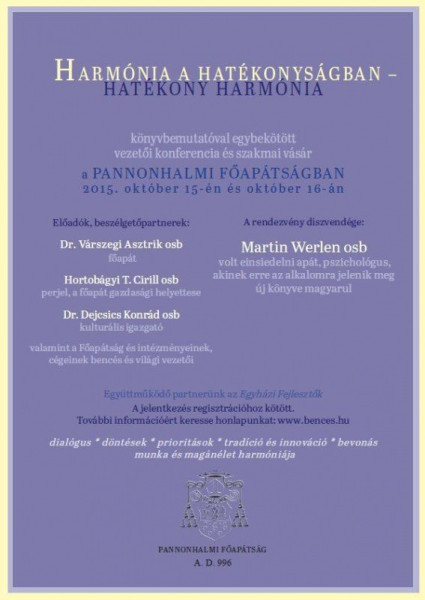 A Pannonhalmi Főapátságban idén Harmónia a hatékonyságban – hatékony harmónia címmel rendezték meg a vezetői konferenciát a főapátság és az Egyházi Fejlesztők közreműködésében. Martin Werlen mellett előadást tartott Várszegi Asztrik OSB főapát, Hortobágyi T. Cirill OSB perjel, a főapát gazdasági helyettese és Dejcsics Konrád OSB kulturális igazgató, valamint a főapátság és intézményei, cégei bencés és világi vezetői.