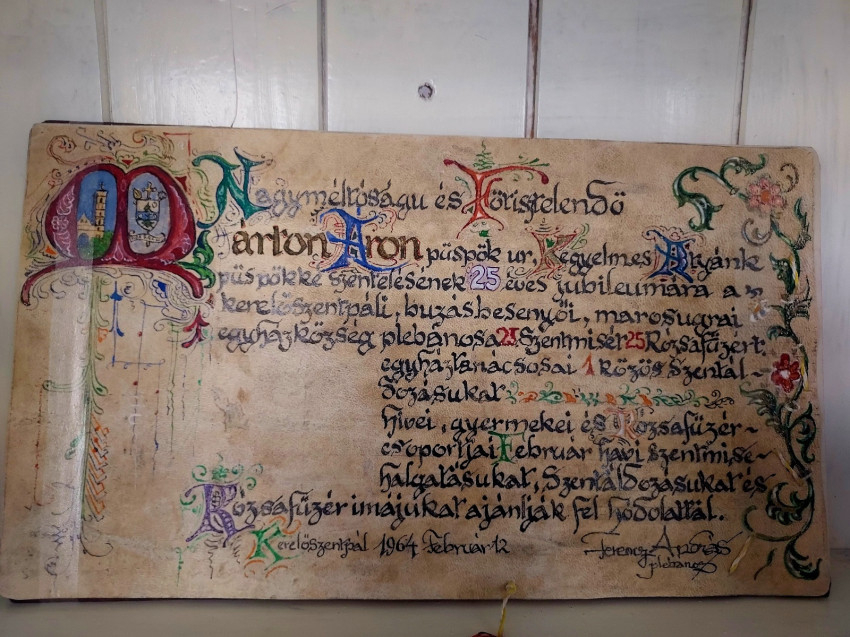 A tárlaton Márton Áron püspöki jelvényei – mitra, pileolus, stóla – mellett néhány, az ünnepi évfordulókhoz kapcsolódó, ajándékba kapott emléktárgy is látható.