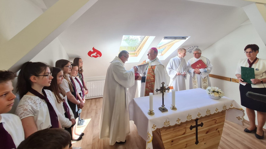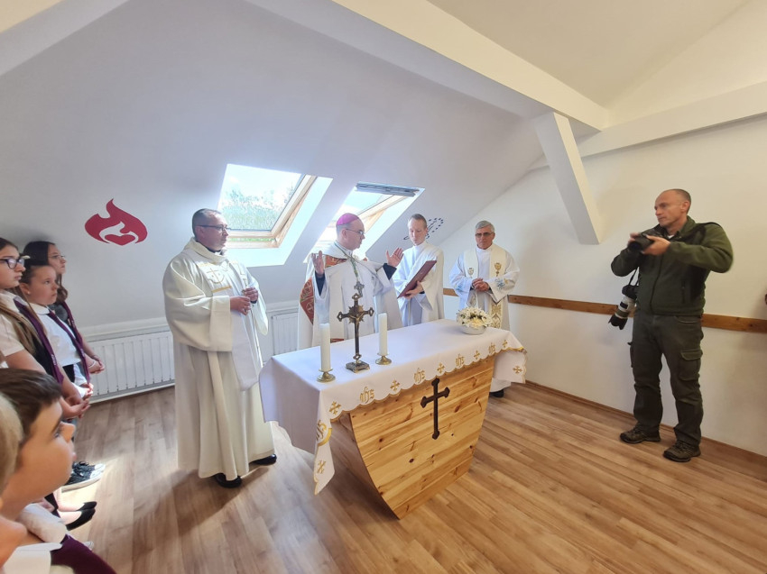 Ezt követően az iskola diákjai léptek fel énekes, zenés és táncos műsorszámokkal, végül a püspök megáldotta az imatermet.