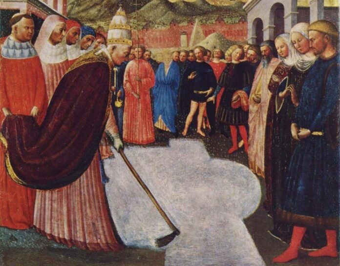 A legenda körülményei a római Santa Maria Maggiore-bazilika felépítésének előzményei voltak. Ezen bazilika helyét a legenda szerint maga a Szűzanya mutatta meg. A 4. században, Liberius pápa idejében történt, amikor is egy Giovanni névre hallgató római patrícius és felesége vagyonát Mária tiszteletére szerette volna felajánlani. Erre a szándékra válaszként a Szent Szűz álmukban arra hívta őket, hogy azon a helyen építsenek az ő tiszteletére templomot, ahol a következő napon havat látnak. A csoda meg is történt, és másnap maga a pápa rajzolta le a templom alaprajzát Róma hét dombjának egyikén. Az általunk bemutatandó festmény ezt a jelenetet örökíti meg.