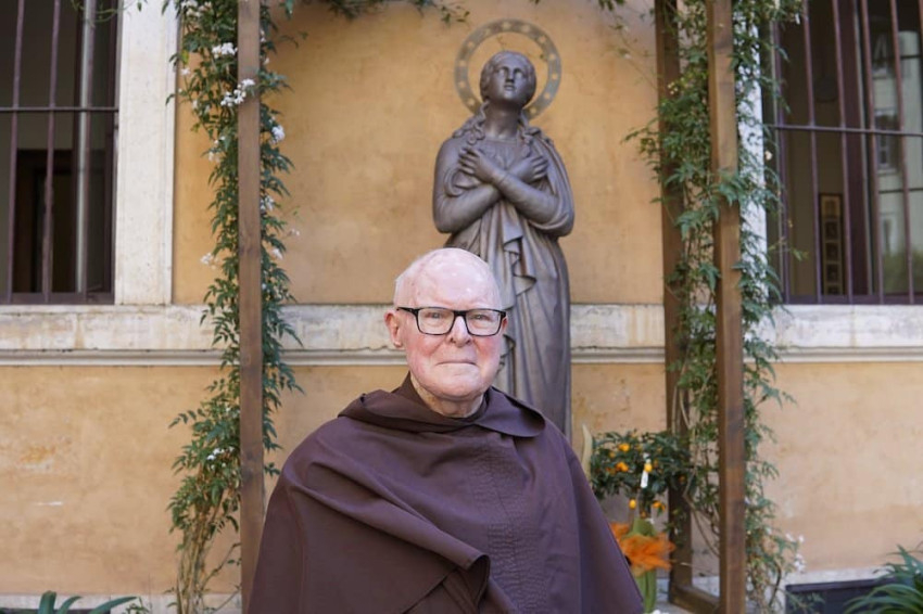 Michael Driscoll OCD a római kármelita rendház Mária-szobra előtt 2022. május 13-án.