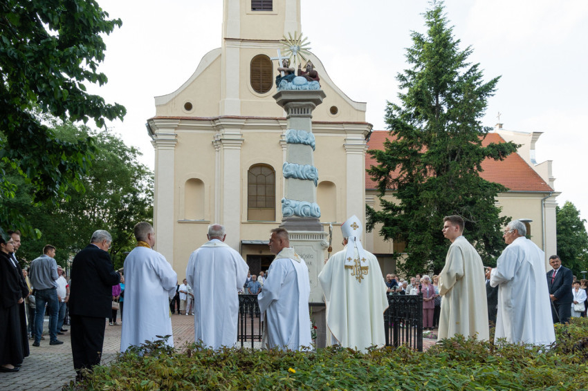 Alig két héttel Szentháromság vasárnapja után és Jézus Szent Szívének főünnepe előtt néhány nappal érdekes összecsengést mutat a Szentháromság-szobor és a Jézus Szíve templom felújításának ünnepe – erre mutatott rá szentbeszédében Mayer Mihály püspök, aki számos múltbéli tényt és történést osztott meg az 1757-ben épült, eredetileg egytornyú és Szent László tiszteletére felszentelt templom építésének körülményeiről, valamint hű képet festett a korról, amelyben a templom épült és működött.