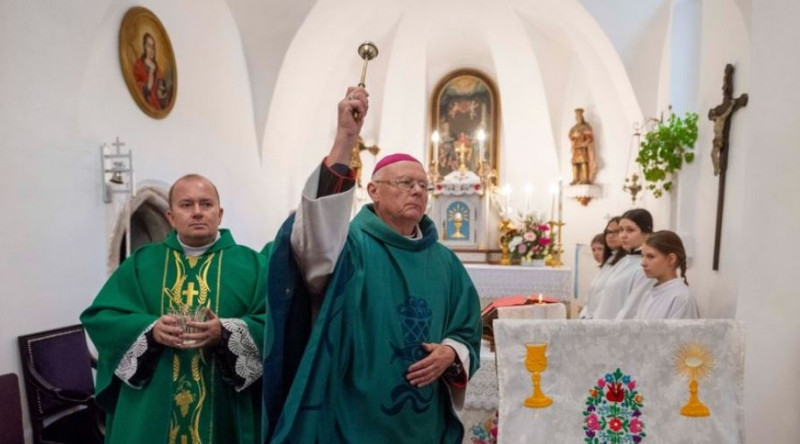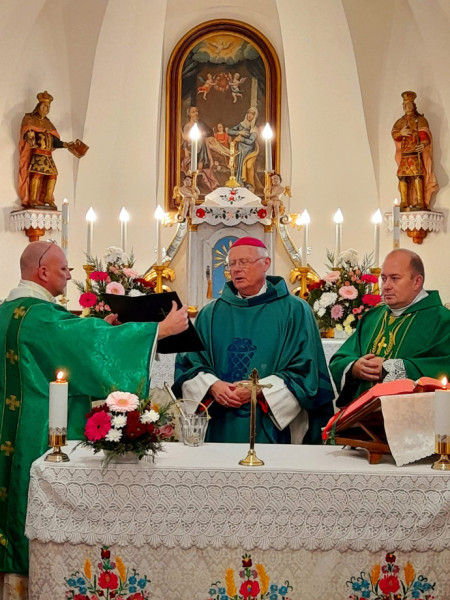 „Fontoljuk meg azt is, hogy mi vagyunk az élő Egyház, akik hitben és szeretetben itt egybegyűltünk. Isten azért állított minket a világba, hogy jele és bizonysága legyünk annak a szeretetnek, amellyel ő szeret minden embert” – hangsúlyozta Varga Lajos, majd szenteltvizet hintett a megújított falakra és a jelenlévőkre.